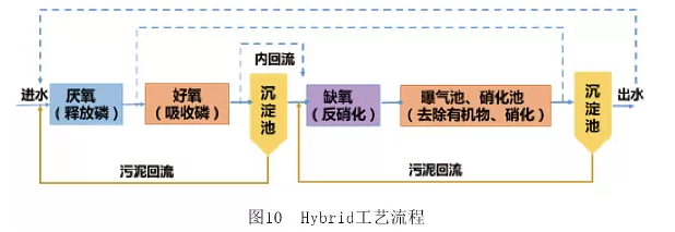 在AO-A2O工藝基礎上奧地利研發出了Hybrid工藝(如圖10),該工藝的兩段之間有三個內回流裝置,可以為第一段曝氣池提供硝態氮、硝化菌以及為第二段曝氣池提供碳源。第一段主要是去除有機物和磷,第二段是硝化功能,并靠第一段曝氣池回流混合液進行反硝化脫氮。