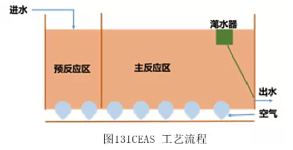 80 年代初,連續進水的 ICEAS 工藝誕生(如圖13)。該工藝在傳統的SBR工藝基礎上,在反應池中增加一道隔墻 ,將反應池分隔為小體積的預反應區和大體積的主反應區,污水連續流入預反應區,然后通過隔墻下端的小孔以層流速度進入主反應區,解決了間歇式進水的問題。