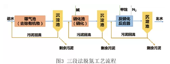 1969年,美國的Barth提出采用三段法除氮(如圖3),第一段是好氧段,主要去除有機物,第二段加堿硝化,第三段是厭氧反硝化,除氮。