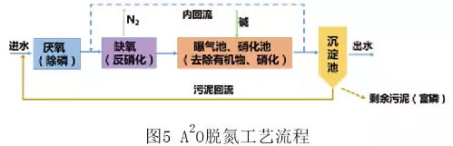 70年代,美國專家在A/O工藝的基礎上,再加上除磷就成了A2O工藝(如圖5)。我國1986年建廠的廣州大坦沙污水處理廠,采用的就是A2O工藝,當時的設計處理水量為15萬噸,是當時世界上最大的采用A2O工藝的污水處理廠。