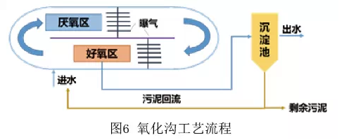 A2O工藝是將生物處理厭氧段和好氧段進行了空間分割,而氧化溝則為封閉的溝渠型結構,結合了推流式和完全混合式活性污泥法的特點,集曝氣、沉淀和污泥穩定于一體。污水和活性污泥的混合液不斷地循環流動,系統中能夠形成好氧區和缺氧區,進而實現生物脫氮除磷(如圖6)。氧化溝白天進水曝氣,夜間用作沉淀池。活性污泥法相比 , 其具有處理工藝及構筑物簡單、泥齡長、剩余污泥少且容易脫水、處理效果穩定等優勢。