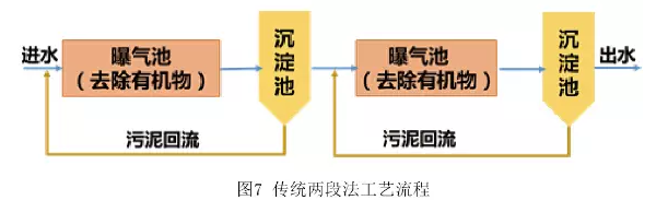 早期的兩段法只是將一套活性污泥法的兩組構筑物串聯,一段和二段曝氣池體積相同,且多合并建設,大部分有機物在第一段被吸附降解,第二段的污泥負荷很低,其出水水質要優于相同體積曝氣池的單級活性污泥法(如圖7)。然而,由于第一段曝氣池體積減小了一倍,相當于污泥負荷增加了一倍,處在易發生污泥膨脹的階段,運行管理較為困難。
