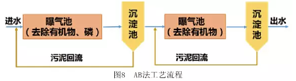 20世紀70年代中期,德國的Botho Bohnke教授開發了AB工藝(如圖8)。該工藝在傳統兩段法的基礎上進一步提高了第一段即A段的污泥負荷,以高負荷、短泥齡的方式運行,而B段與常規活性污泥法相似,負荷較低,泥齡較長,A段由于泥齡短、泥量大對磷的去除效果很好,經A段去除了大量的有機物以后B段的體積可大大減小,其低負荷的運行方式可提高出水水質。但是由于A段去除了大量的有機物導致B段碳源缺失,所以在處理低濃度的城市污水時該工藝的優勢并不明顯。
