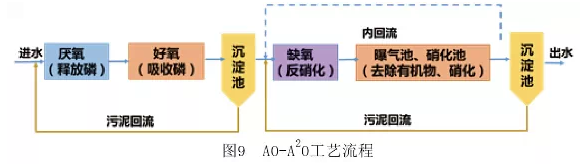 其后,為了解決脫氮時硝化菌需要長泥齡,除磷時聚磷微生物需要短泥齡的矛盾,開發了AO-A2O工藝(如圖9)。該工藝由兩段相對獨立的脫氮和除磷工藝組成,第一段泥齡短,主要用于除磷,第二段泥齡長、負荷低,用于脫氮。
